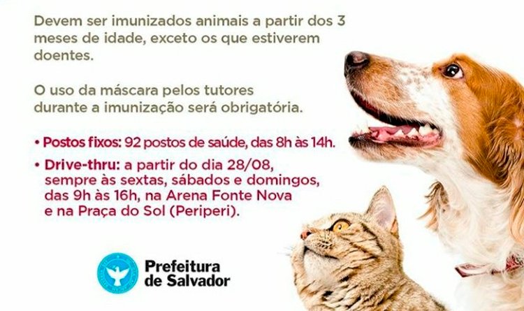 De maneira pioneira no país, Salvador adotará o sistema de drive-thru para imunização dos animais. O sistema onde os pets poderão ser imunizados sem descer dos veículos funcionará a partir de 28 de agosto, sempre às sextas, sábados e domingos, das 9h às 16h, em dois pontos fixos: Arena Fonte Nova e Praça do Sol, em Periperi.